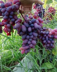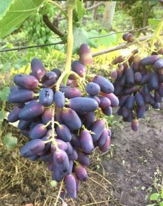Виноградины имеют вытянутую пальчиковую форму и достигают до 12-16 г в весе. Плоды покрывает не очень толстая мягкая кожура розово-красного или темно-фиолетового цвета.